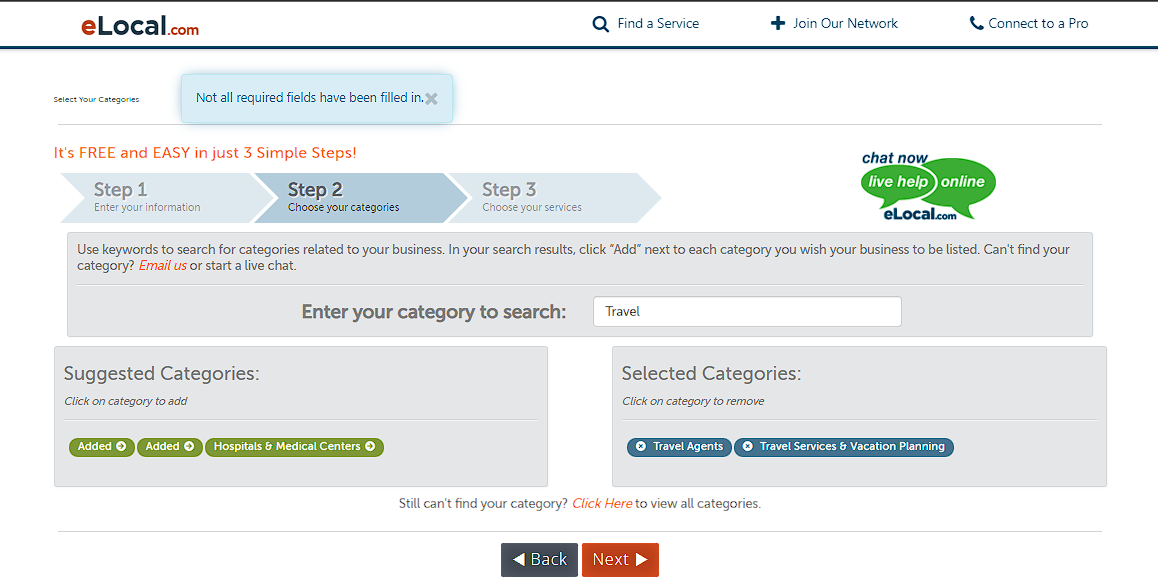 Paso 6: Elija la categoría y subcategoría de su empresa y proporcione una breve descripción de su empresa. eLocal tiene una amplia gama de categorías entre las que elegir, así que tómese su tiempo para seleccionar la que describa con precisión su empresa.