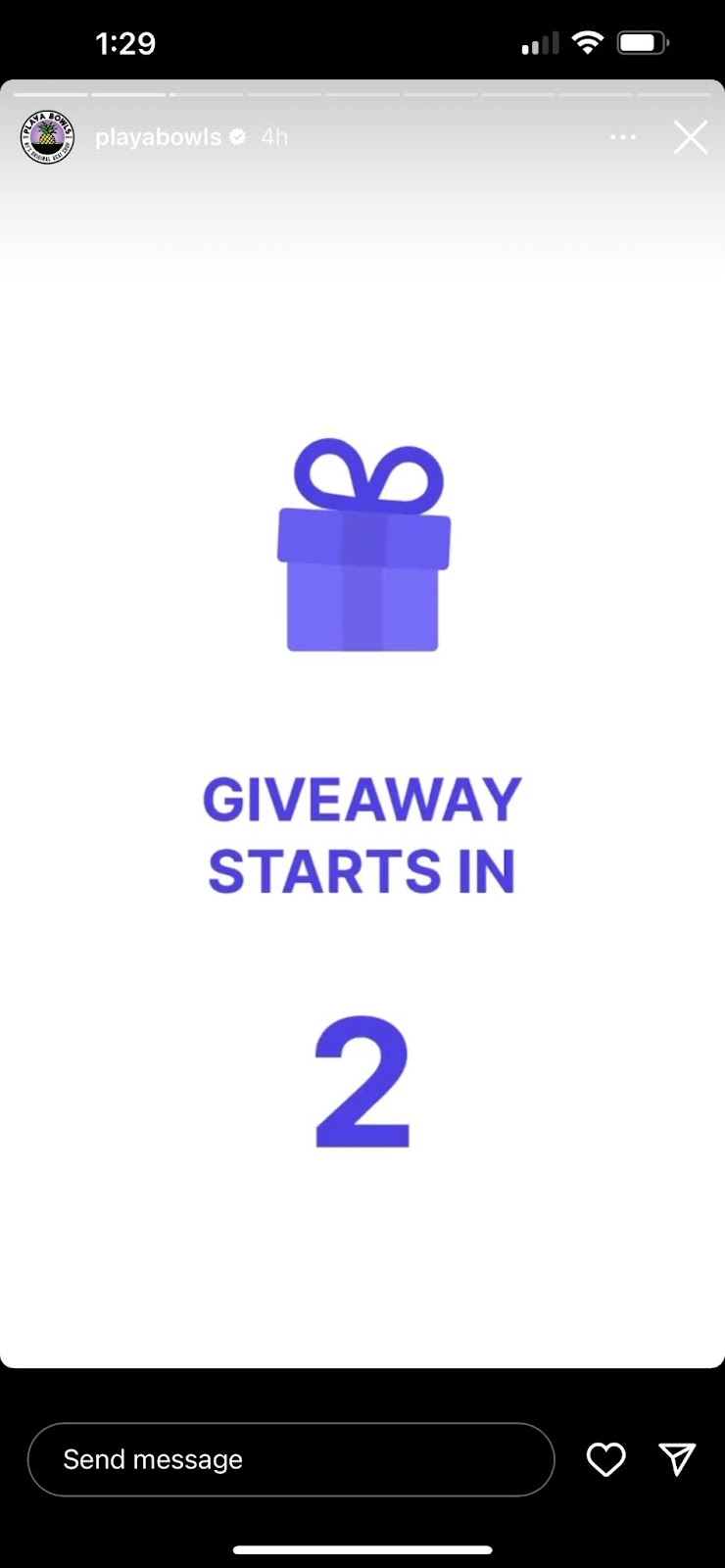 Playa Bowls realizaron una campaña de sorteos en su historia de Instagram. Los sorteos son una forma estupenda de generar actividad y participación, ya que suelen incluir publicaciones cruzadas, comentarios, etiquetar a otras personas o volver a publicar el anuncio del sorteo para participar, y dan como resultado un ganador que puede generar más interés y lealtad hacia tu marca.
