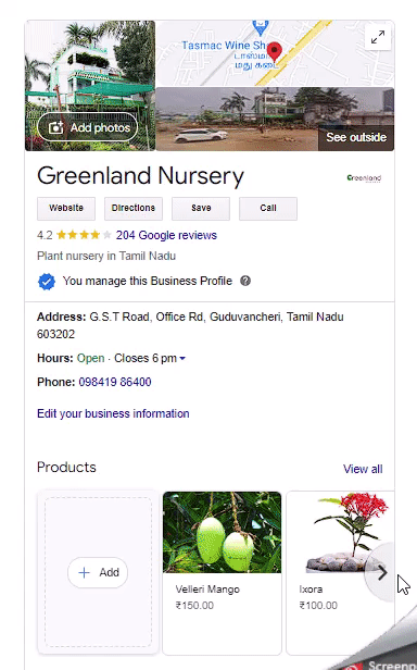 Paso 9: Puedes revisar tus productos desde tu perfil de Google My Business en el «Panel de conocimiento» del lado derecho, en Productos sección.