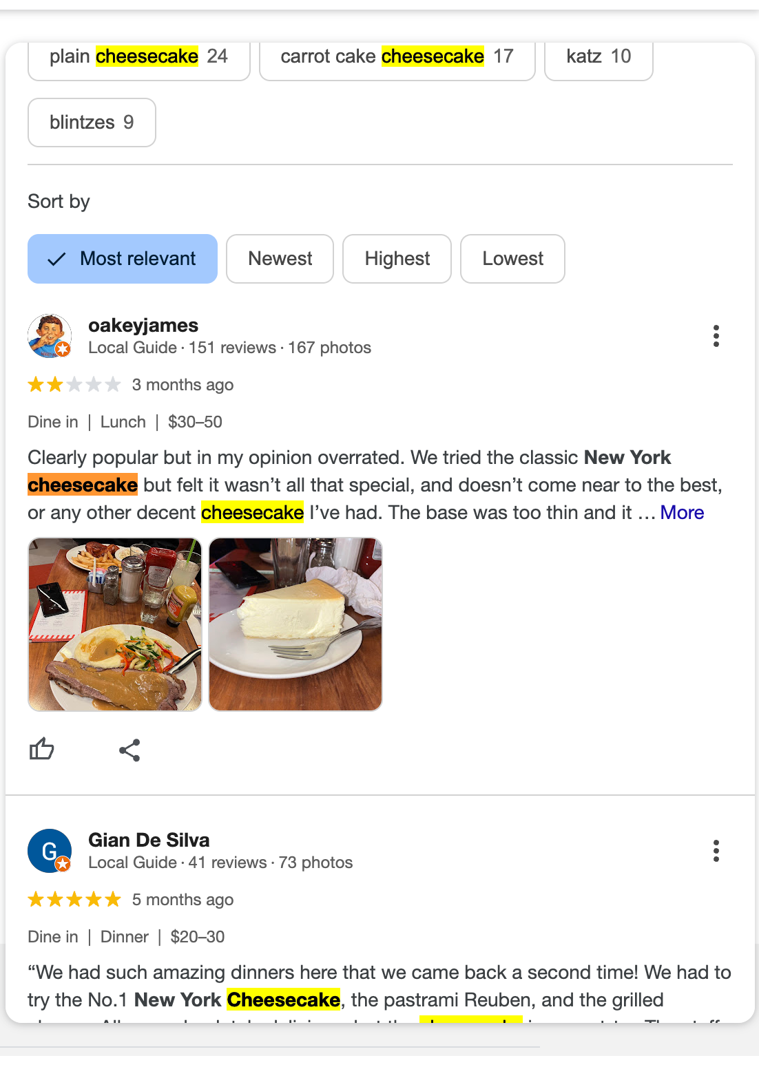 7. Google destacará las reseñas que contengan tu palabra clave.