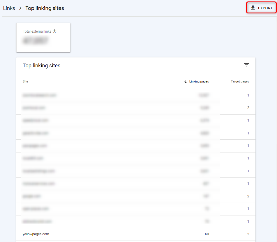 - Revisa la lista de backlinks de los «principales sitios enlazados» que aparece en el informe. Busca cualquier enlace que parezca spam, irrelevante o de baja calidad. Presta atención a los patrones sospechosos o a las fuentes que parezcan manipuladoras.