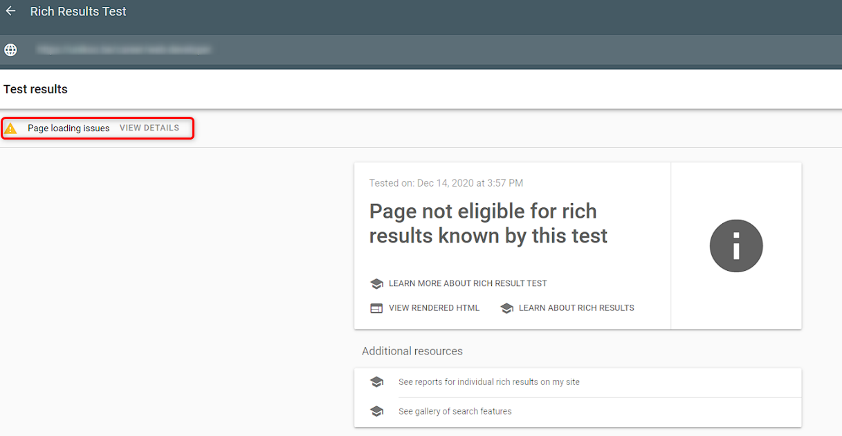 - En la página de resultados enriquecidos, verás una lista de páginas con problemas. Haz clic en un tema específico para ver los detalles. También puedes visitar la página search.google.com/test/rich-results y enviar la URL de la página para detectar cualquier problema con los resultados enriquecidos.