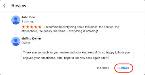 9. Haga clic en «Enviar» para enviar su respuesta. Tu respuesta estará visible para el público en tu perfil empresarial de Google.