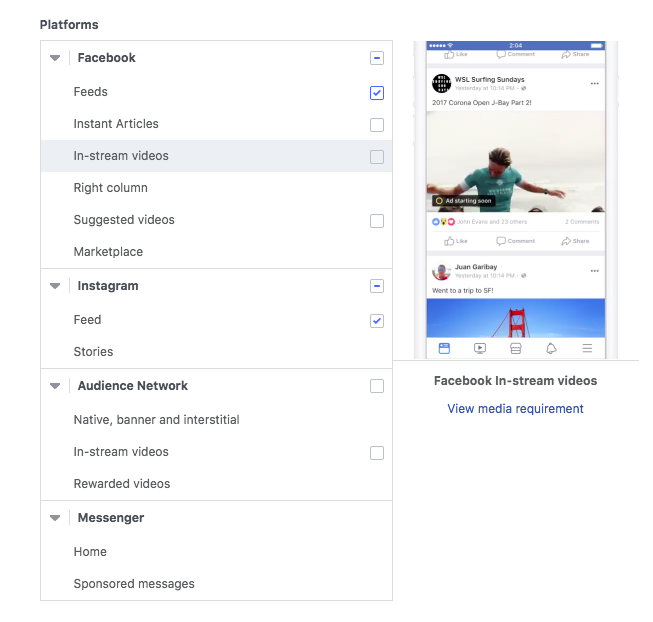 Ten en cuenta que la colocación de anuncios en los feeds de Facebook es obligatoria, incluso si decides personalizarla. Sin embargo, puedes elegir el tipo de dispositivo (móvil, de escritorio o todos los dispositivos) en el que quieres que aparezca tu anuncio.