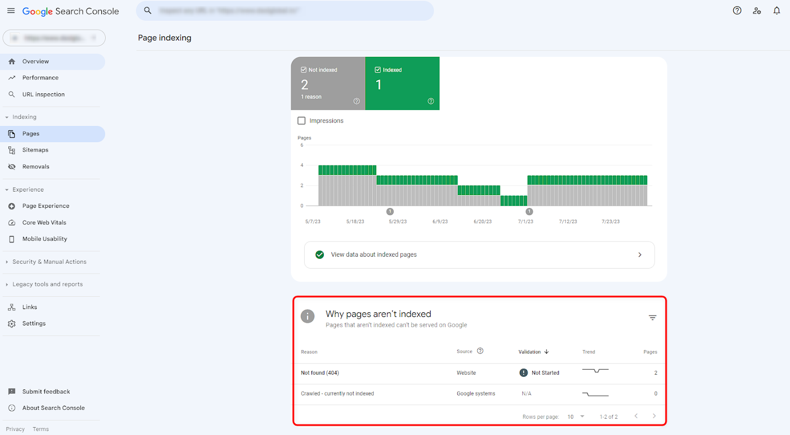 - En la parte izquierda del panel de control de Search Console, haz clic en «Páginas» en la sección Indexación. Este informe muestra el estado de indexación de todas las URL de tu propiedad que Google ha visitado o intentado visitar.