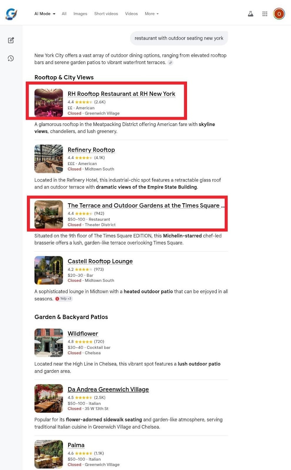 For local and multi-location businesses, this shift is seismic. A restaurant that dominates Google’s local pack might be completely absent from a Google AI Mode recommendation because its review text doesn’t mention specifics like “outdoor seating” or “gluten-free options” explicitly.