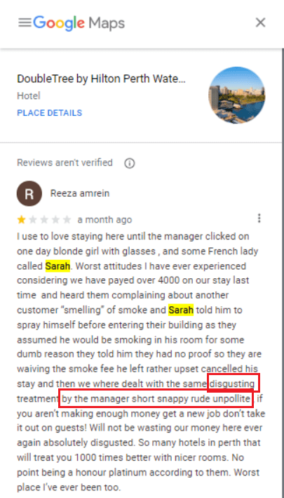 Eche un vistazo a esto: un huésped del hotel publica una crítica mordaz en la que califica al personal de «repugnante», «repugnante» y «grosero». No es constructivo, es solo una perorata. Google señaló y respondió que la reseña era inaceptable, citando su directriz sobre el discurso civilizado.