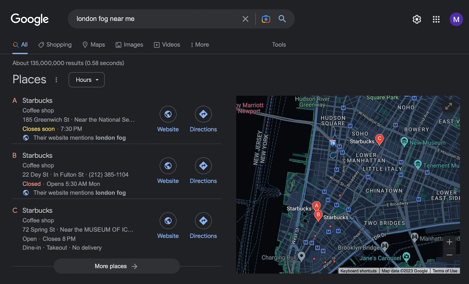 Por ejemplo, una búsqueda de «cafetería» arroja resultados locales que destacan la intención de búsqueda local.