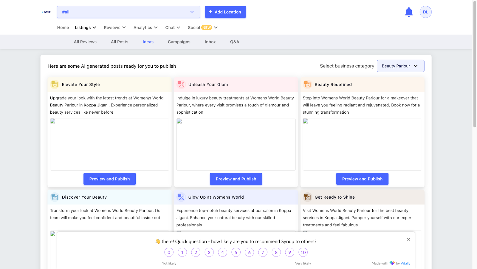 Synup also curates ideas for you based on your preferences, industries, and categories so that you don’t have to put in too much thought while having to maintain your social media presence and interact with your patients.
