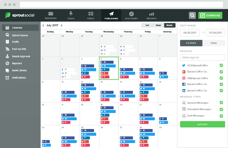 Sprout, quant à lui, consolide tous les messages planifiés en un seul endroit pratique, rationalisant ainsi le processus de planification. Pour améliorer la convivialité, il inclut des vues filtrées, vous permettant de trier et de vous concentrer sur des types de contenu spécifiques. Une caractéristique remarquable est le système d'approbation à plusieurs niveaux de Sprout, qui prend en charge diverses parties prenantes, notamment les équipes des agences, les directeurs et les clients.