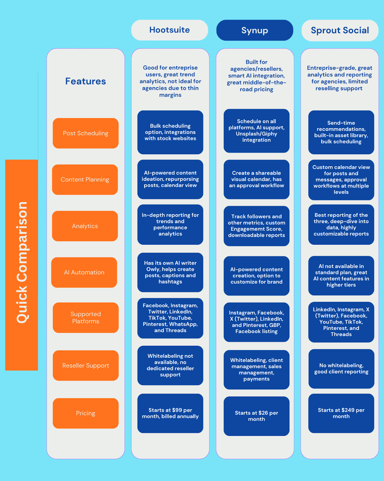 Sprout Social contre Hootsuite contre Synup : assistance aux revendeurs