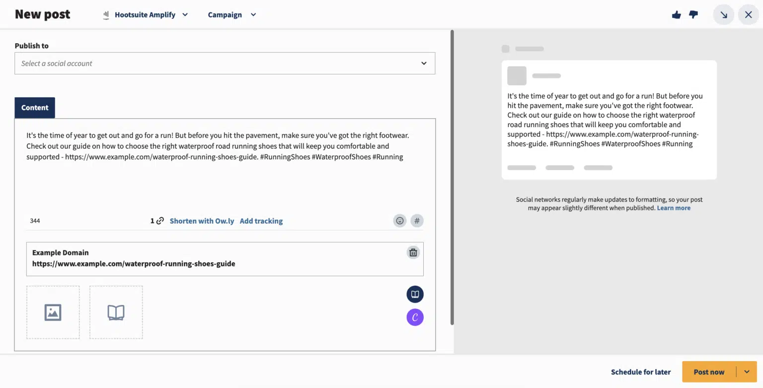 La propre IA OwlyWriter de Hootsuite génère des légendes, des hashtags et du contenu de vacances attrayants à partir de courtes descriptions ou d'URL. Il peut créer des idées de contenu à partir d'invites et rédiger des articles complets. L'outil permet également une planification groupée, fonctionnant essentiellement comme une équipe de contenu automatisée.