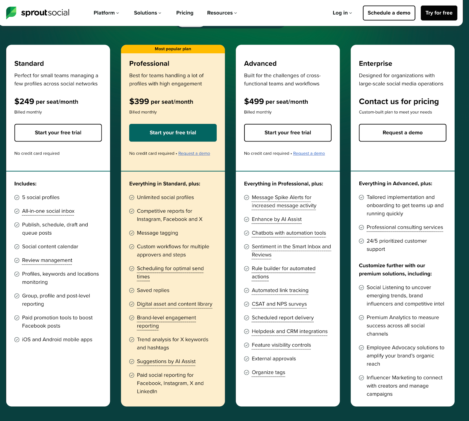 Sprout fournit un Essai gratuit de 30 jours. Le plan standard bÀ partir de 249$ par mois (facturé mensuellement), à l'exclusion des fonctionnalités d'IA. C'est un outil haut de gamme. Les agences doivent se renseigner sur la tarification personnalisée en fonction du nombre de clients.