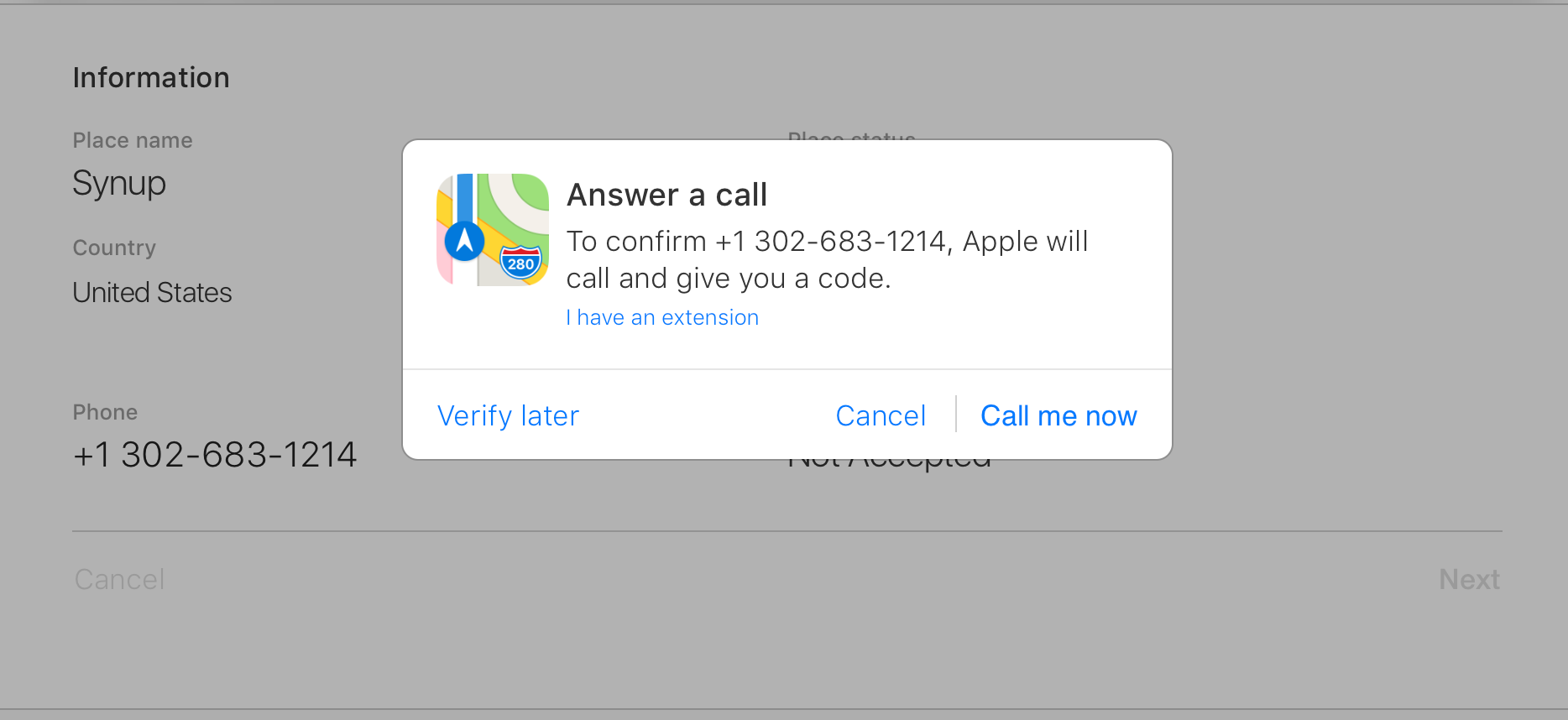 Une fois que vous avez ajouté votre entreprise ou tenté de revendiquer une entreprise qui existe déjà sur Apple iPhone Maps, le service déclenche un appel téléphonique pour valider votre identité.