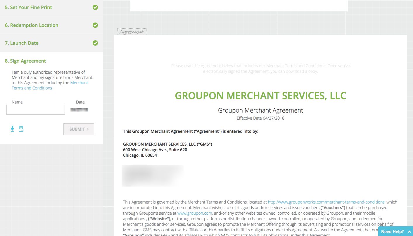 Après avoir fourni tous les détails et élaboré votre offre, y compris sa date de lancement, vous devrez signer numériquement un accord généré automatiquement entre votre entreprise et Groupon.