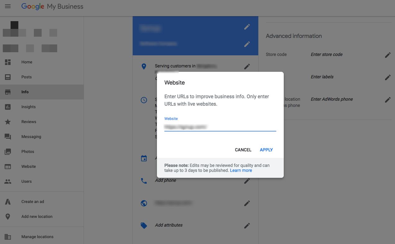 Dans la boîte de dialogue qui apparaît, accédez au site Web de votre entreprise et cliquez sur « Appliquer ». Votre site Web sera désormais lié à votre profil GMB et sera visible par les internautes en ligne.