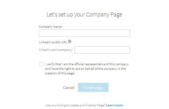 Une fois que vous avez terminé l'étape ci-dessus, vous serez dirigé vers la fenêtre suivante. Entrez le nom de votre entreprise et l'URL de l'entreprise LinkedIn. La page d'entreprise de votre entreprise n'a pas besoin d'être unique, mais votre URL publique doit l'être.