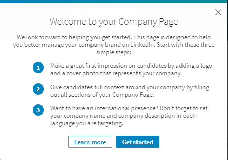 Remarque : vous serez redirigé vers votre page d'entreprise LinkedIn où vous serez invité à démarrer. Vous pouvez cliquer sur « Commencer » pour mettre à jour les informations relatives à votre entreprise sur votre page.