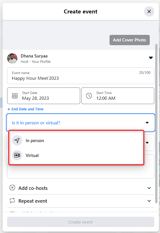 Étape 3 : Très bien, vous devez maintenant choisir : événement en ligne ou en personne ? Si vous voulez que les gens de la région passent par votre magasin ou votre établissement, optez pour une visite en personne. Mais s'il s'agit d'un webinaire ou d'un événement en ligne uniquement, choisissez en ligne.