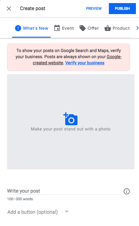 Vous avez également la possibilité d'ajouter un bouton d'appel à l'action (CTA), afin de permettre à votre public d'interagir plus facilement avec votre entreprise. Cependant, ce bouton n'est pas disponible sur les publications « Offres », car vous avez déjà la possibilité de créer un lien vers la page Web où les utilisateurs peuvent les utiliser.