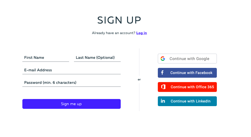 Accédez au Page d'inscription de la plateforme sur laquelle vous créez un compte gratuitement et mettez à niveau ultérieurement votre outil selon le plan tarifaire approprié. Commencez par saisir votre nom, votre adresse e-mail professionnelle et créez un mot de passe. Vous pouvez également simplifier le processus et vous connecter via Google, Facebook, Office 365 ou Linkedin.