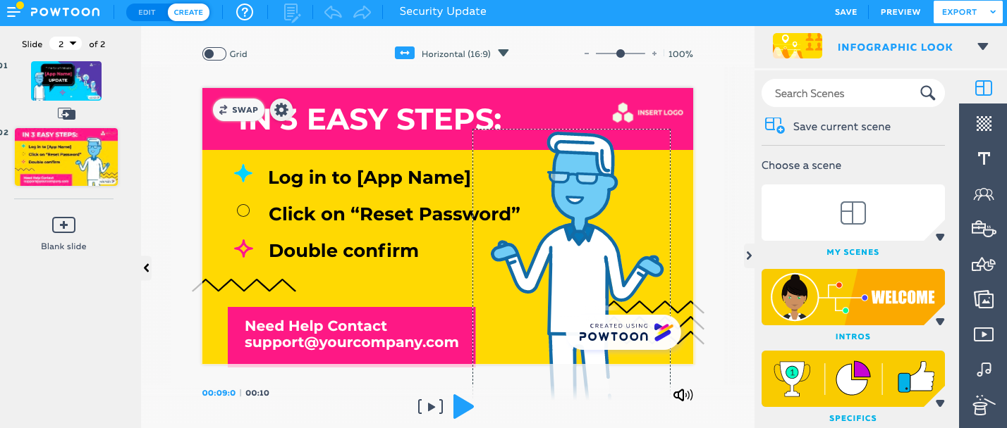 Powtoon permet à ses utilisateurs de créer ou de modifier chaque élément de la diapositive, y compris l'animation, le texte et les illustrations.