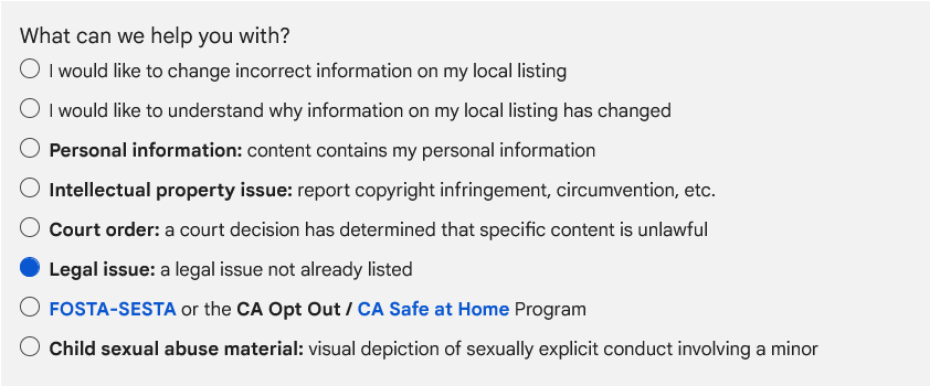 En cas de problème juridique, signalez-le en sélectionnant le lien « Signaler un problème juridique » en bas de la liste. Ensuite, indiquez-leur le type de problème que vous souhaitez signaler.