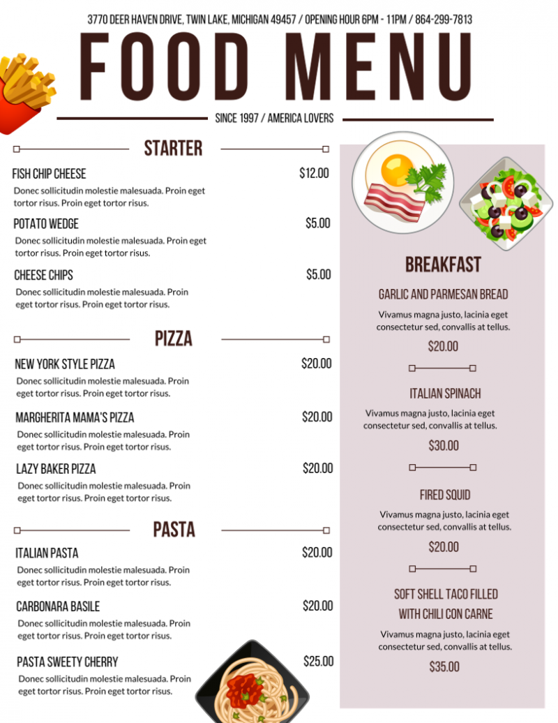 sur votre menu. Demandez à un photographe professionnel de prendre des photos de vos plats exclusifs afin de pouvoir travailler avec des images en haute résolution. Si vous pensez que la police et la palette de couleurs sont suffisantes pour votre menu, tenez-vous-en. Nous ne voulons pas que votre menu soit encombré de plusieurs choses, vous vous souvenez ?