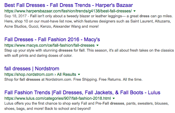 Dans cet exemple, des mots clés secondaires tels que « Mode », « Tendances » et « Vestes » ont été utilisés pour les mots clés « Robe d'automne ».
