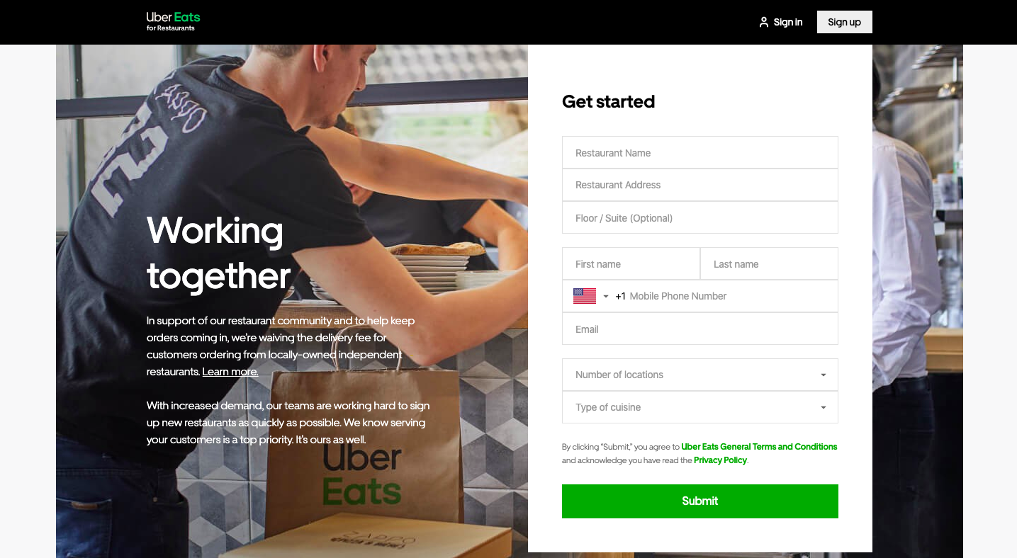 Dirigez-vous vers page d'inscription conçu pour les restaurants sur le site Web UberEats. Renseignez les informations de votre restaurant, c'est-à-dire le nom de votre restaurant, son adresse, le type de cuisine que vous servez, etc.