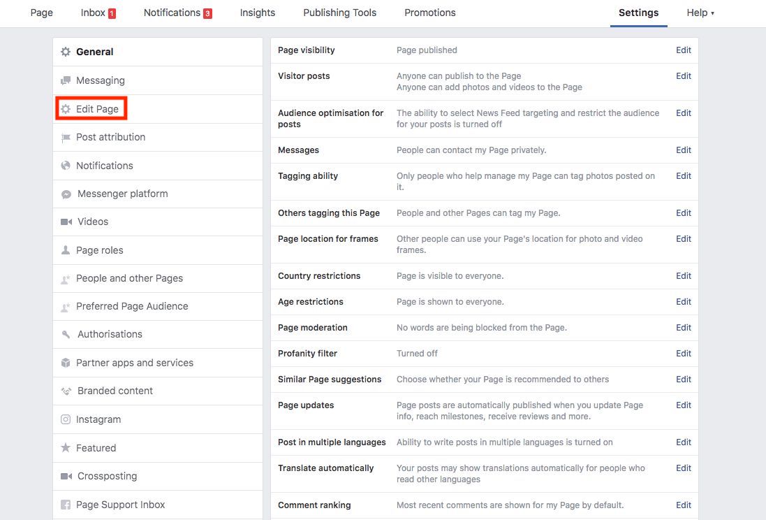 Dans le menu Paramètres, cliquez sur l'option « Modifier la page » dans la barre latérale gauche. Cela vous montrera une liste de tous les onglets de votre page.