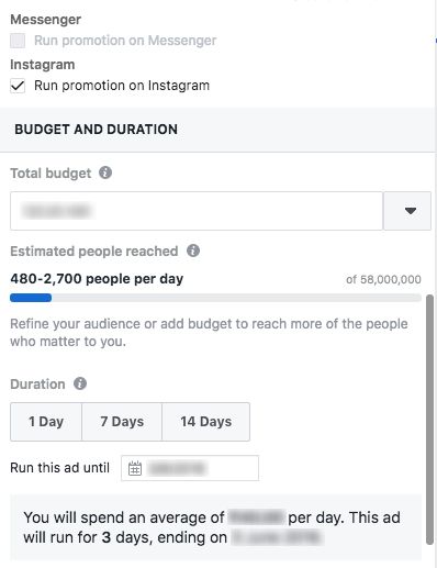 C'est le moment de choisir votre budget et la durée de votre promotion. Facebook vous indiquera une estimation du nombre de personnes que votre publication atteindra en fonction de ces facteurs et de certains autres facteurs tels que votre public cible et l'historique des promotions précédentes (si disponible).
