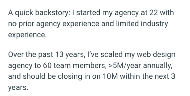 Take the story of one founder who started his web design agency at 22 with no industry connections or money, but persevered with skill and consistency. Over 13 years, he built a 60-person team and crossed $5M in yearly revenue, now pushing toward $10M.