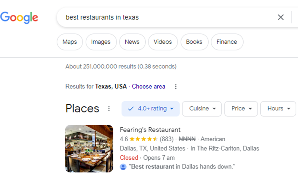 You must have local citations on directories like these to increase your chances of getting found by people looking for your business. This is because Google and other search engines return these types of results for local queries. The image below shows an example of looking up restaurants in Texas on Google