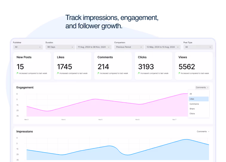 A comprehensive analytics suite focused on business metrics – track reach, engagement, and network growth. Generate executive-ready reports for stakeholder reviews.