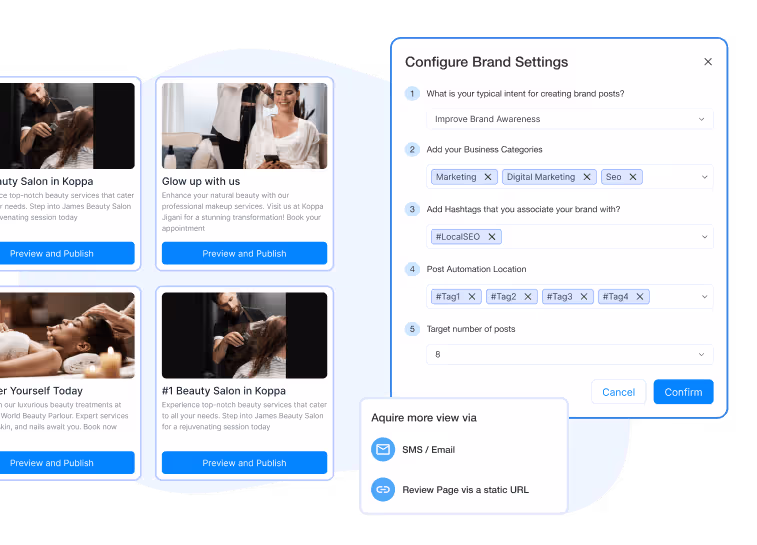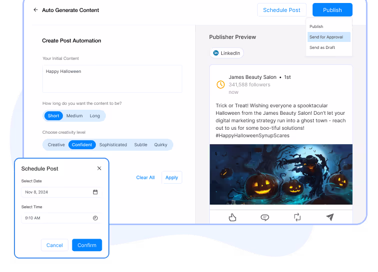Synup helps you plan and schedule your LinkedIn posts in advance. Use our AI to draft compelling copy and include rich media for maximum impact.