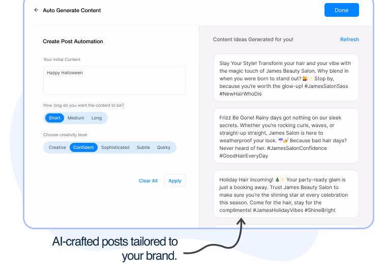 Our AI assists in crafting polished, engagement-worthy posts that maintain your brand voice while staying relevant to your industry and business.