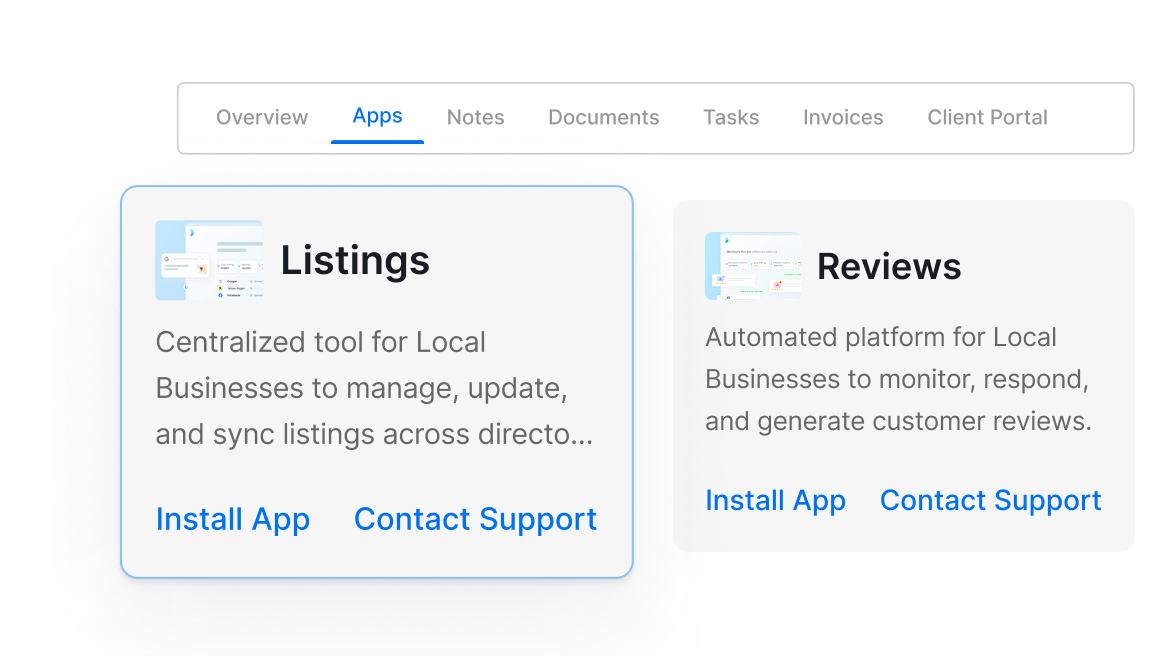 Activez ou désactivez facilement les applications marketing telles que les listes, les réseaux sociaux, les avis et le suivi SEO en fonction des besoins ou du plan de chaque client.