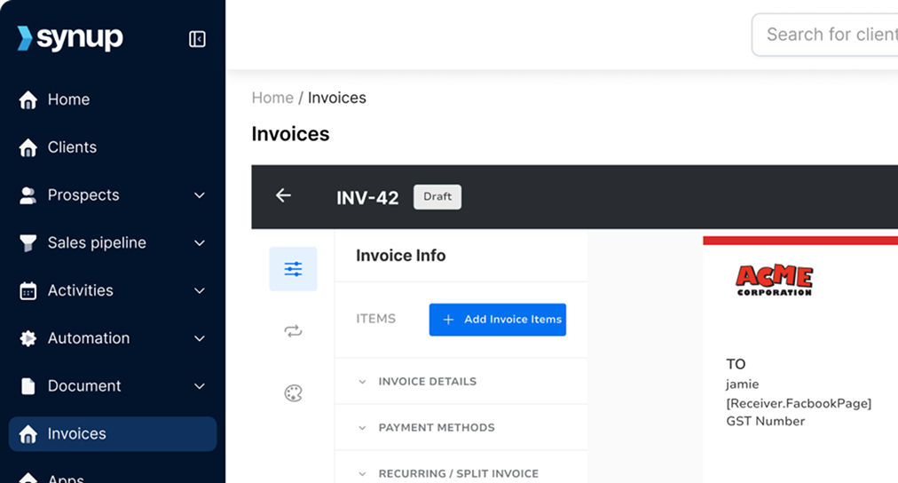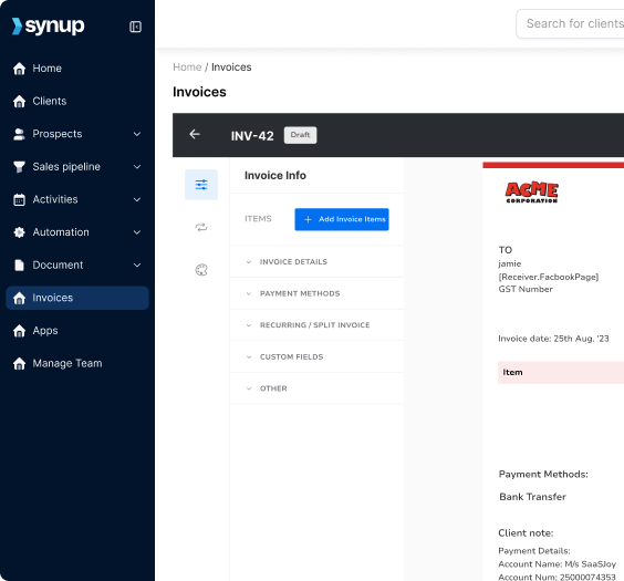 Des factures intelligentes aux signatures électroniques fluides, vos clients bénéficient d'un ensemble complet d'outils, hébergés sur votre domaine et optimisés par Synup.