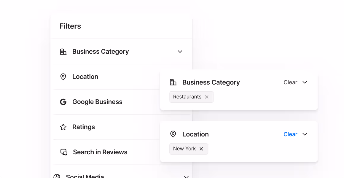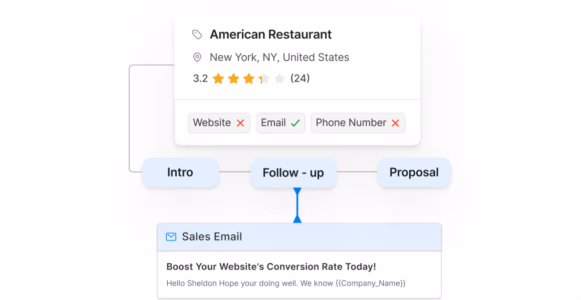 Accédez à une base de données de plus de 40 millions de PME. Effectuez des recherches par secteur d'activité, lieu, évaluations, lacunes en matière de référencement, présence sur les réseaux sociaux, etc. Créez des listes personnalisées de prospects chaleureux et à fort potentiel.