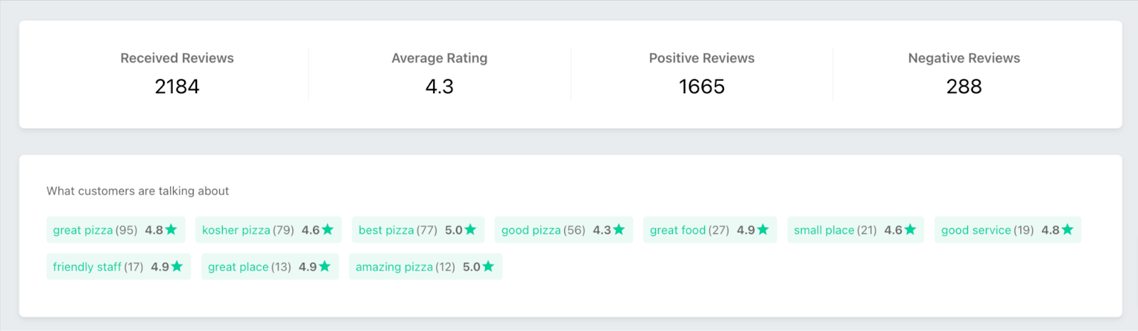 Étape 2 : Vous serez redirigé vers une page d'aperçu où vous pourrez consulter tous vos avis en un seul endroit. Vous obtiendrez également un aperçu de votre réputation : notes moyennes et critiques négatives. Vous remarquerez les termes surlignés qui apparaissaient le plus fréquemment dans vos commentaires.