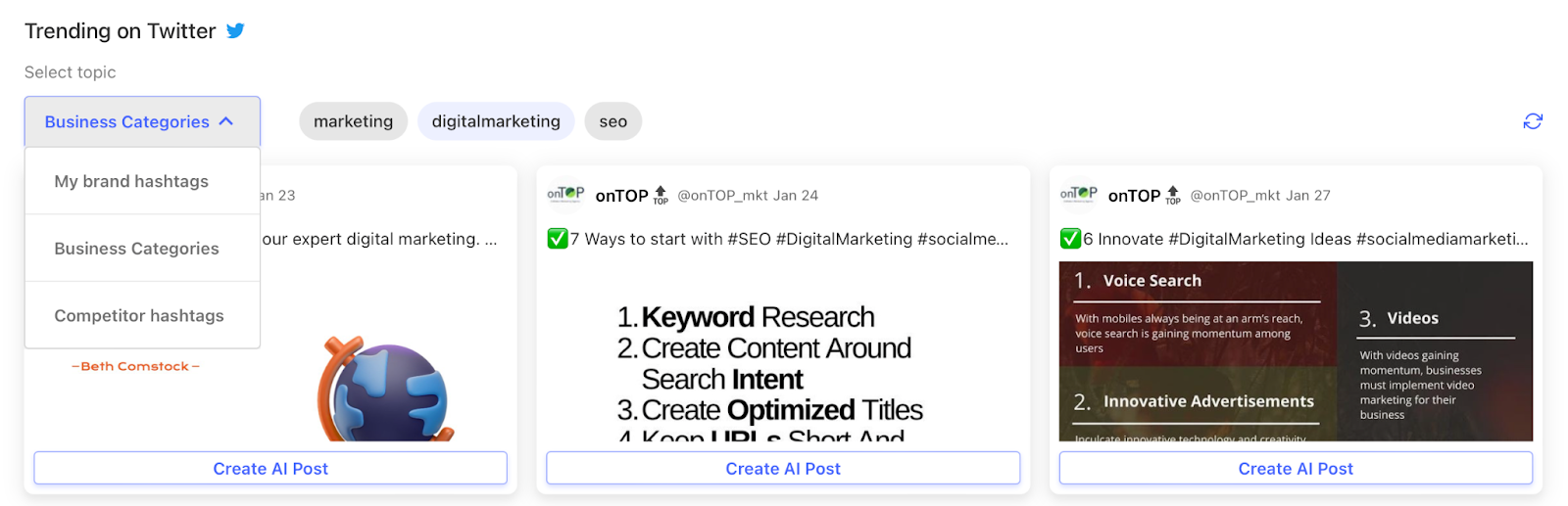 À partir de là, vous pouvez consulter les publications de vos concurrents, les nouveautés dans les catégories professionnelles que vous avez définies et suivre les hashtags. Nous allons vous montrer ce qui est en vogue, afin que vous puissiez économiser des heures de recherche !