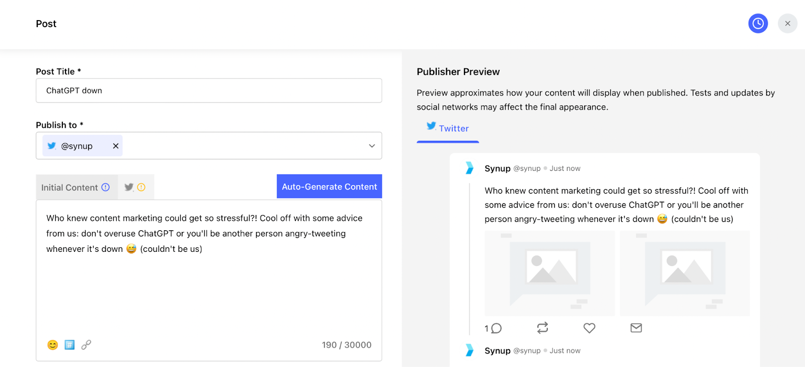 Maintenant, remixons l'article sur la panne de ChatGPT ! Cliquez sur « Republier » pour accéder à l'éditeur de publication, où vous pouvez modifier la publication manuellement ou utiliser notre générateur de contenu alimenté par l'IA pour lui donner une nouvelle tournure.