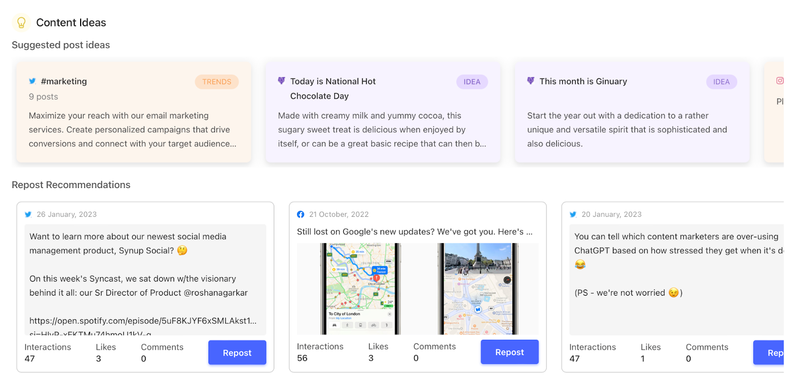Directement sur le tableau de bord social de Synup, nous vous montrons vos meilleures publications et un aperçu des idées de contenu (celles-ci sont extraites de l'onglet « Idées », que nous aborderons dans une minute).