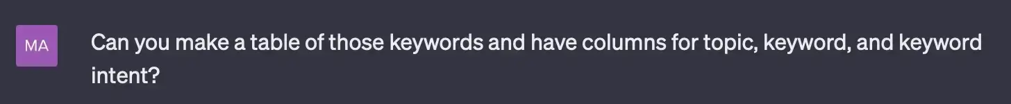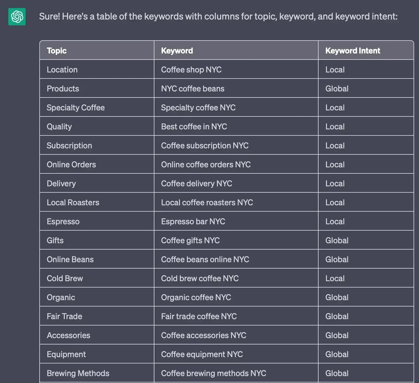 To sort keywords by intent, you can feed ChatGPT a list of keywords and key phrases that you want to rank for. Then, ask ChatGPT to sort them by topic, keyword, and intent. This way, instead of searching for each of your target keywords individually to see whether they have local intent, you can just feed your keyword list into ChatGPT and have the AI sort it for you.