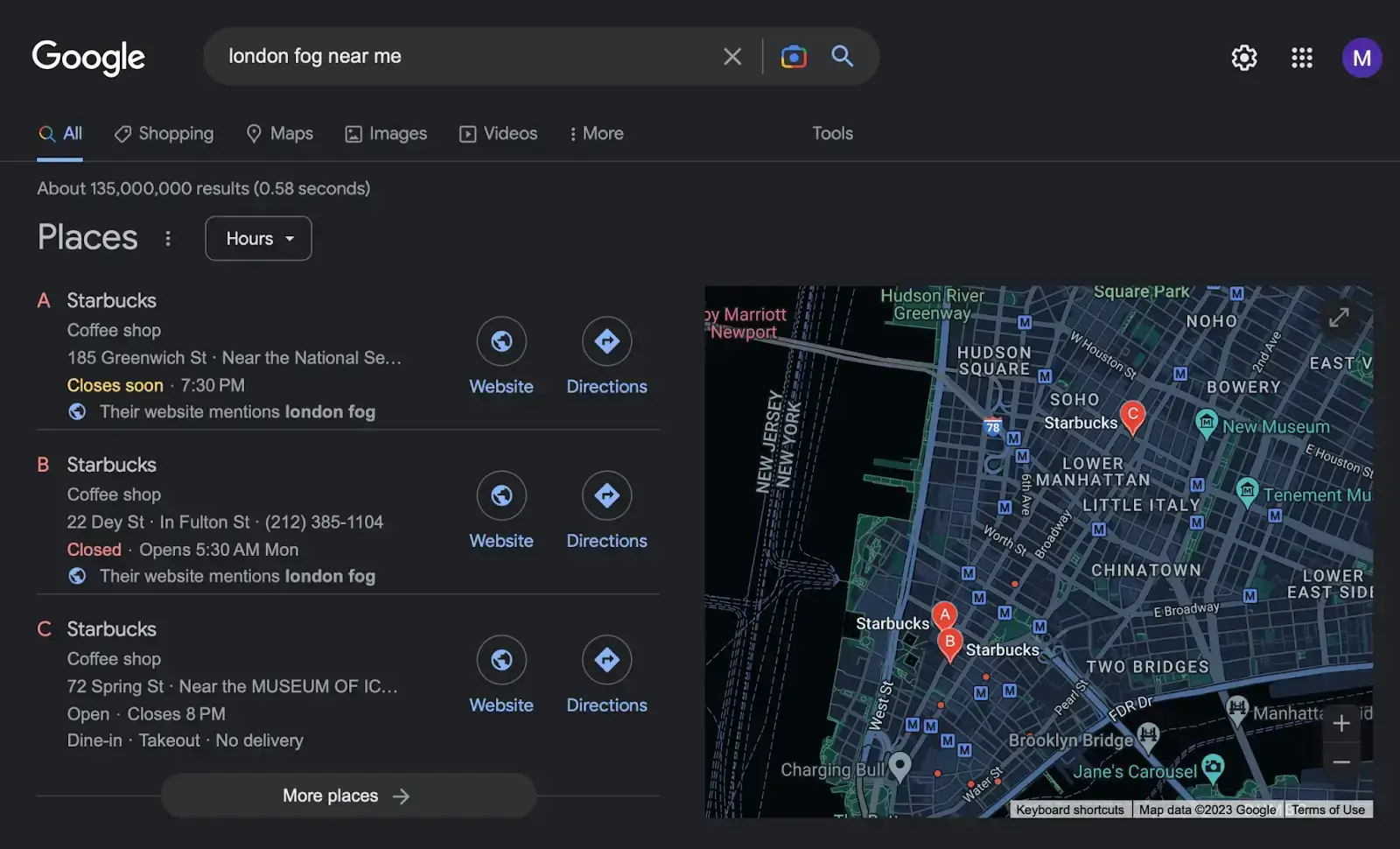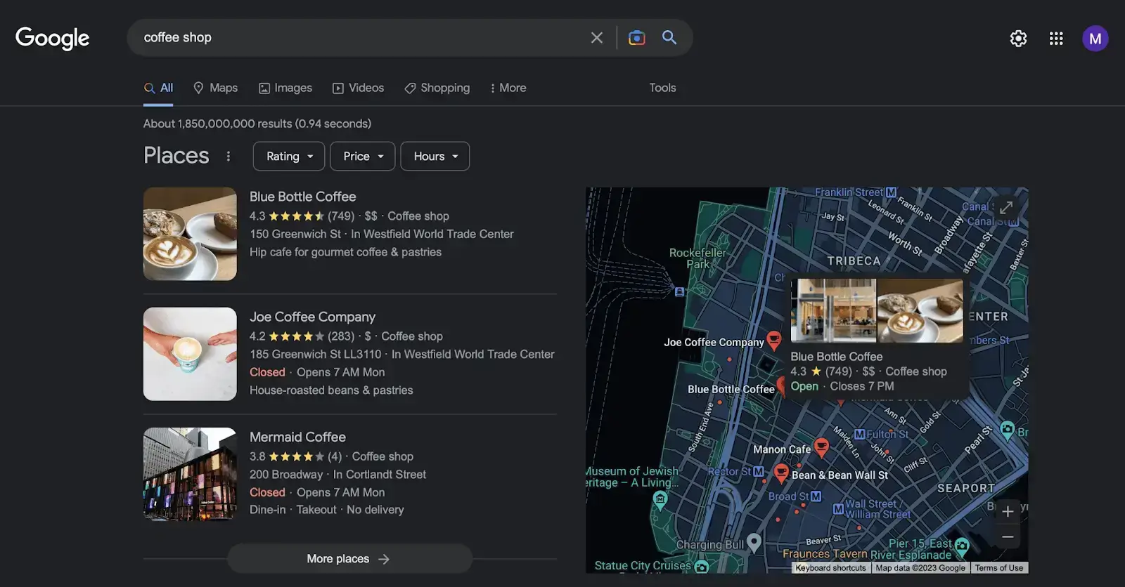 For example, a search for “coffee shop” yields local results, highlighting the local search intent.