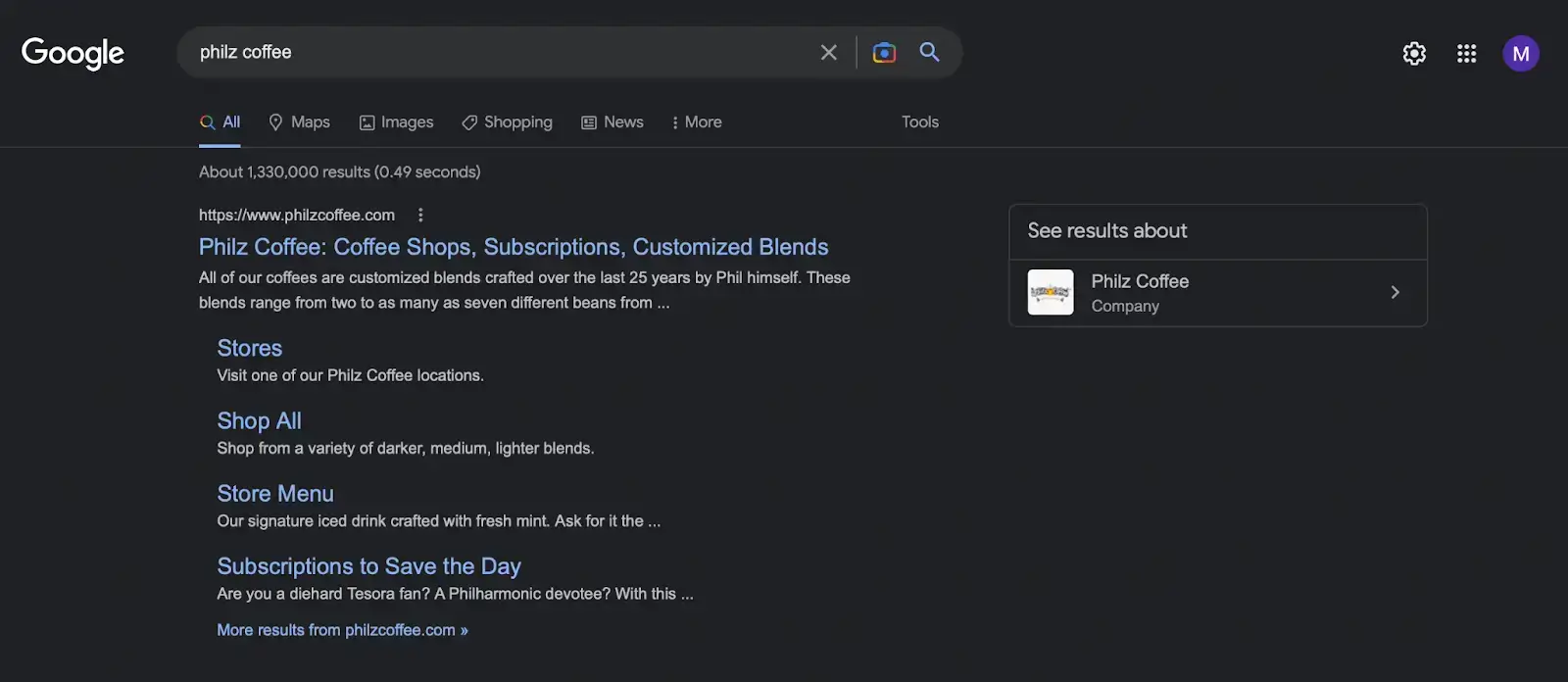 Here’s what it looks like when a search doesn’t have local intent. Searching for Philz Coffee (a popular brand on the west coast) doesn’t yield local search results because there aren’t any Philz Coffee shops nearby. So someone in New York searching for Philz would likely be searching to purchase coffee beans or other Philz merchandise (rather than searching for the locations to visit in-person).