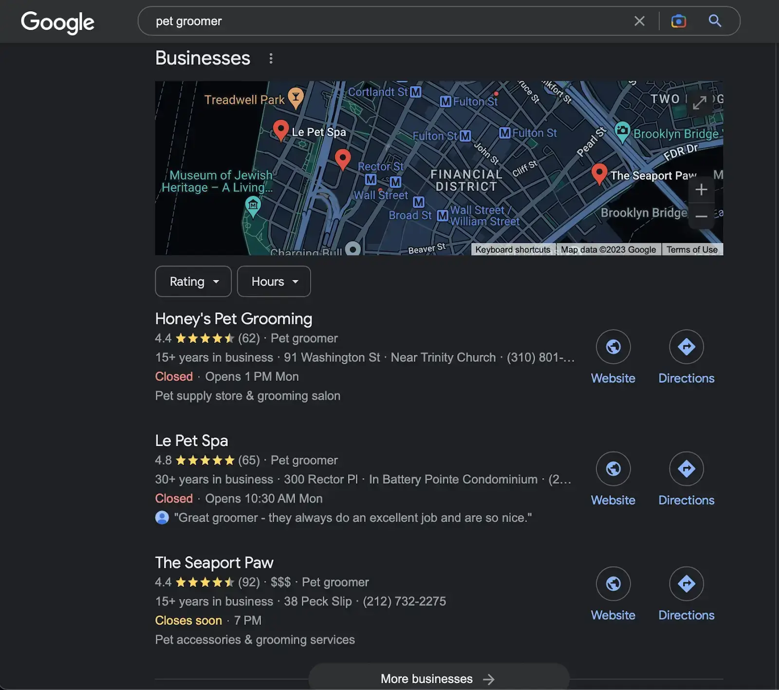 For example, searching “how to clip a dog’s nails” doesn’t yield any local results. But Google shows results (in this case, mainly videos) from various animal care providers. If the searcher were located near any of the businesses with videos on how to clip a dog’s nails, they might consider taking their dog to that business next time they needed a groomer!