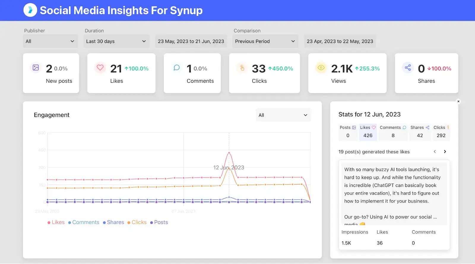Clients want results. And when it comes to social media, your clients need to see that what you’re doing is driving engagement. Although most social media management platforms have great reporting and analytics features, it’s hard to share data when your client can’t access the platform, too. That’s why we added shareable analytics to Synup Social.